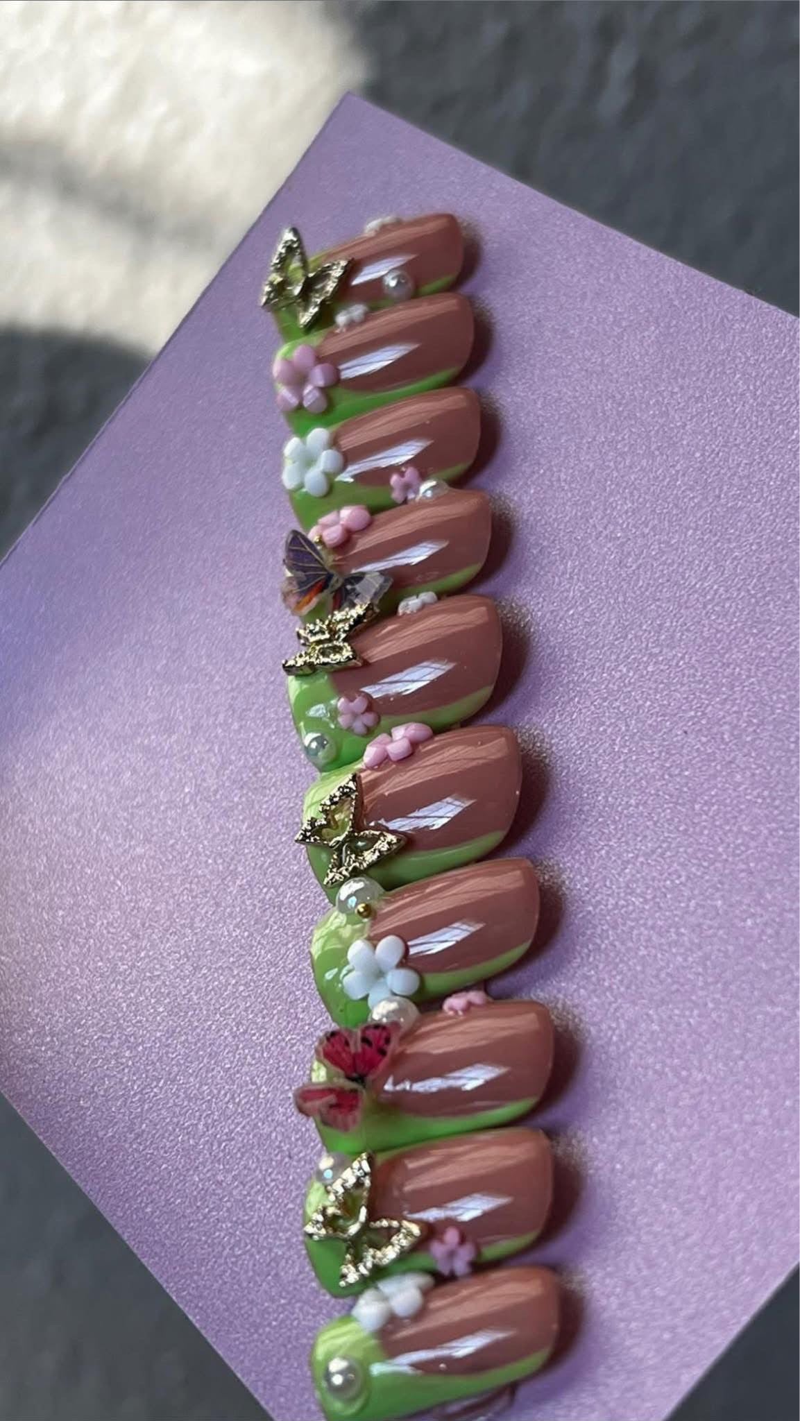 Short green French tips with a nude base, covered in flowers and gold butterflies! A perfect set for spring time! Can be made into any length.